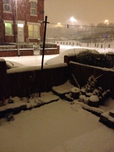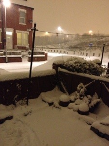 There was naff all snow after swimming, we’d had a little flurry so I thought that was it. As we were say watching TV, Lawlor text saying he had a shitload of snow, and we said we hardly had any….and then we opened the door…and we had around 6inches at least! It’s still falling like crazy. Thi was the view around 9pm :