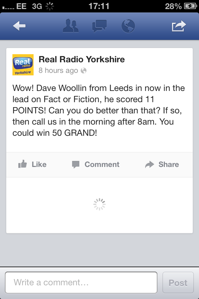Real Radio are currently running a huge competition called “Fifty Grand Friday” across the entire Real Radio network. The rules are simple. Phone in, get picked at random, answer questions with only “Fact” or “Fiction” for 50 seconds and the person who wins each week wins £500, and the winning person in the entire month goes forward to represent their radio station area in a final showdown for the chance to win £50,000