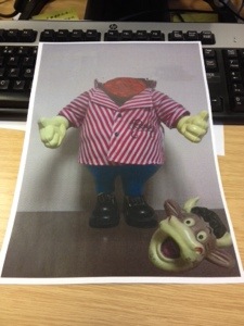 Yesterday a series of Facebook messages and photos appeared with my Bendy Bully being “Bully-napped” by the girls at work…and now this…a photo of a decapitated Bully. Shocking. If I get a phonecall off the kidnapper, I might have to go all Liam Neeson on them “I will find you…and I will kill you!”