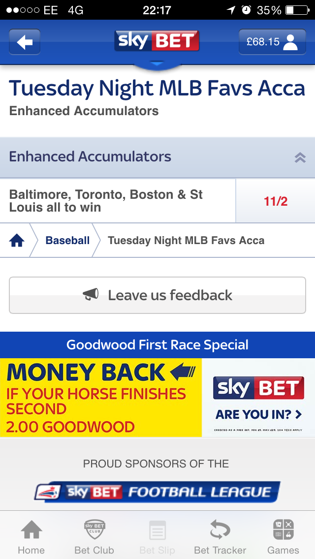 I have been on the app on my phone. I was talking in the research meeting that I bet on the baseball…it’s something I have started in the last few weeks after Steve (friend, fellow baseball addict and fellow games how contestant) had told me he did the same. The bets are, each day, 33p on each of these :