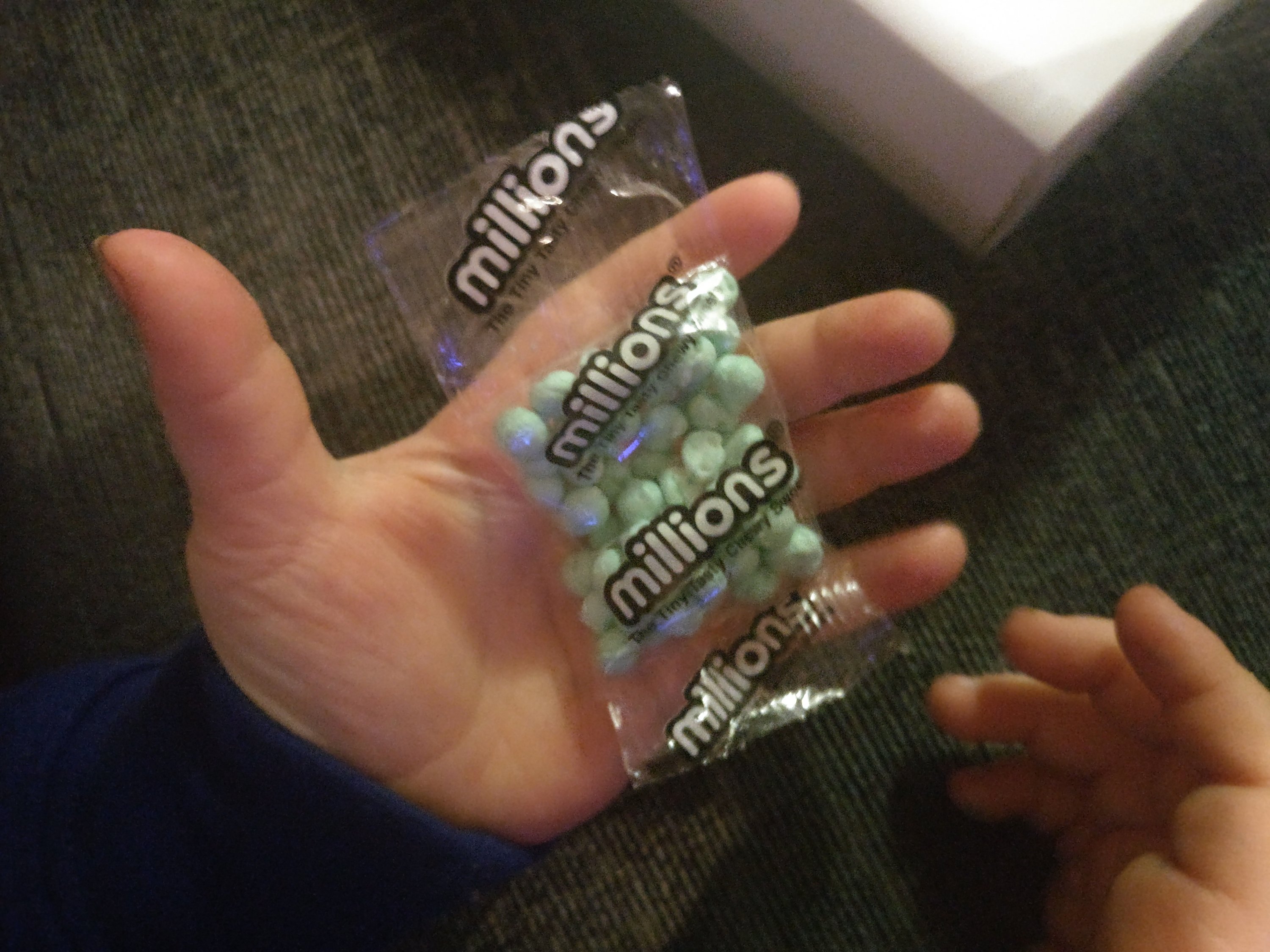 This one caused utter carnage…mainly because in the packaging, two small bags of millions were in the tray for today, not one. We realised that some had dropped out of the #10 door so wedged them back into the box…but they were the pink ones. Althea has seen them. She now has green ones in her hand….and, despite having never tasted them in her life…those words were spoken….”I don’t like them!”