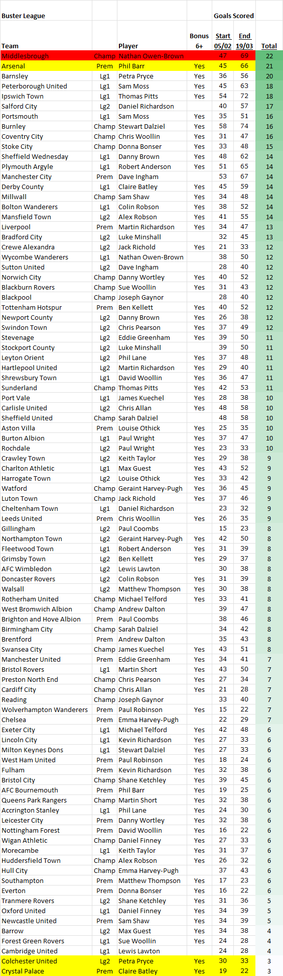Scoring started on Sunday 5th February for this game…and on Sunday 19th March, Arsenal scored the 4 goals they needed to win the Buster Game 4.