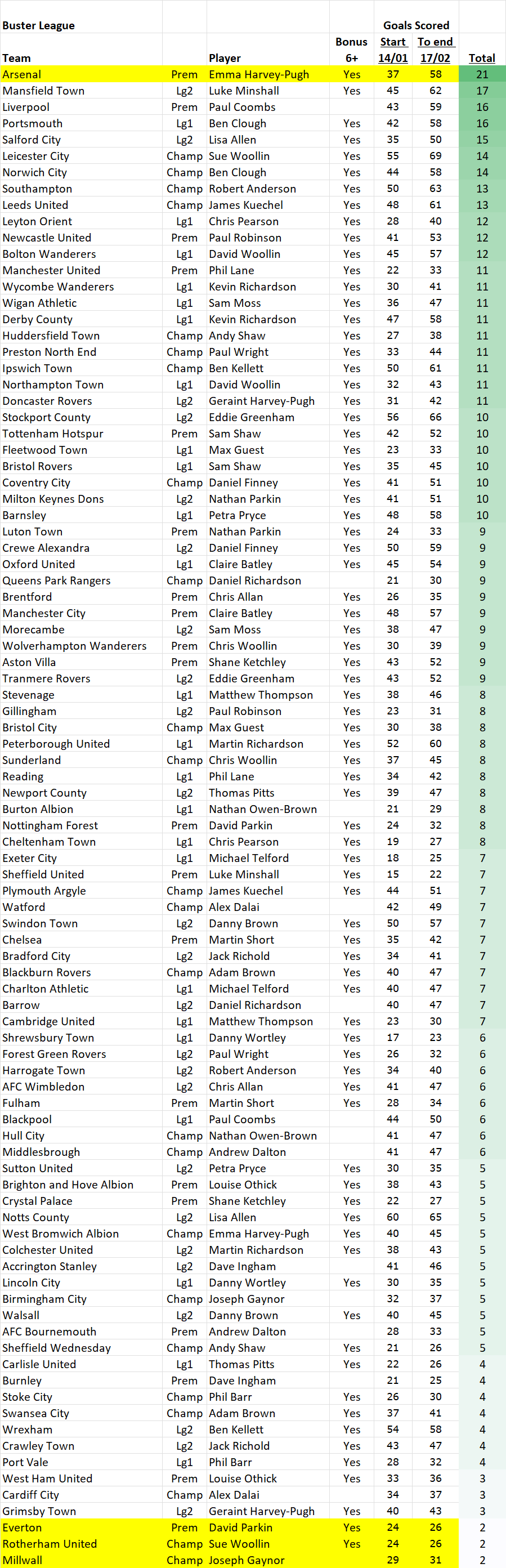 The rules are simple. We split out the 92 League teams across all players. Follow your team’s goals…all you have to do it hit 21 goals WITHOUT going over! Each gameweek ends at the end of each day…so if you hit 21 on a Saturday and someone hits it on Sunday, the team on Saturday wins it.