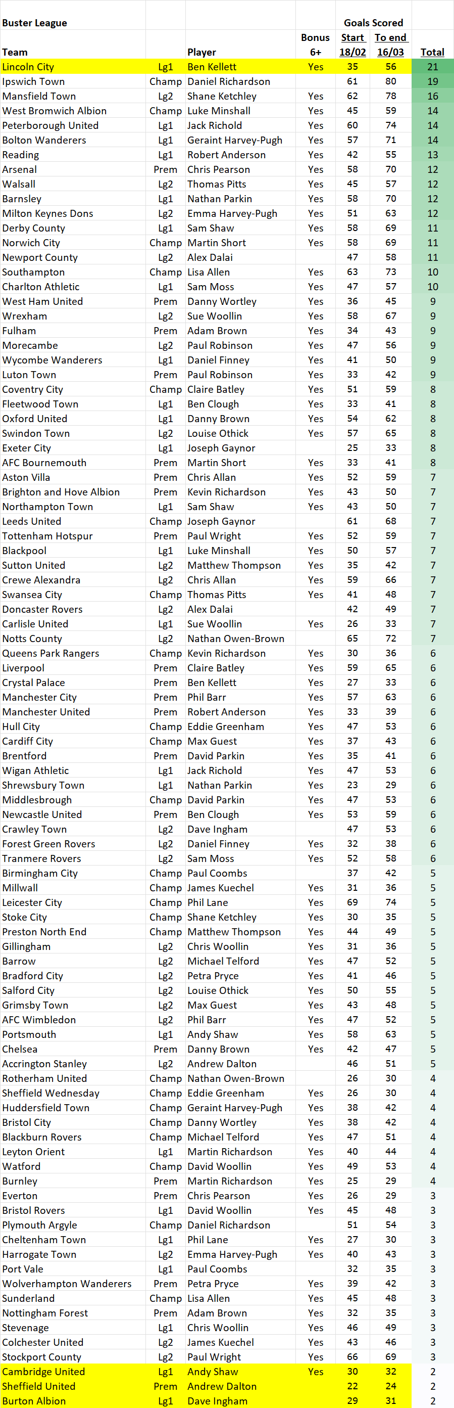 We have a WINNER of Game 5 after only 4 weeks! Lincoln just went goal crazy and their 5 goals on Saturday 16th March won them the pot. They take 90% of the pot and £165.60 will be heading off to Ben Kellett. Three teams at the bottom were Cambridge, Sheff Utd and Burton Albion who all only scored 2 goals for Andy Shaw, Andrew Dalton and Dave Ingham who share £18.40 between them, winning £6.13 each.