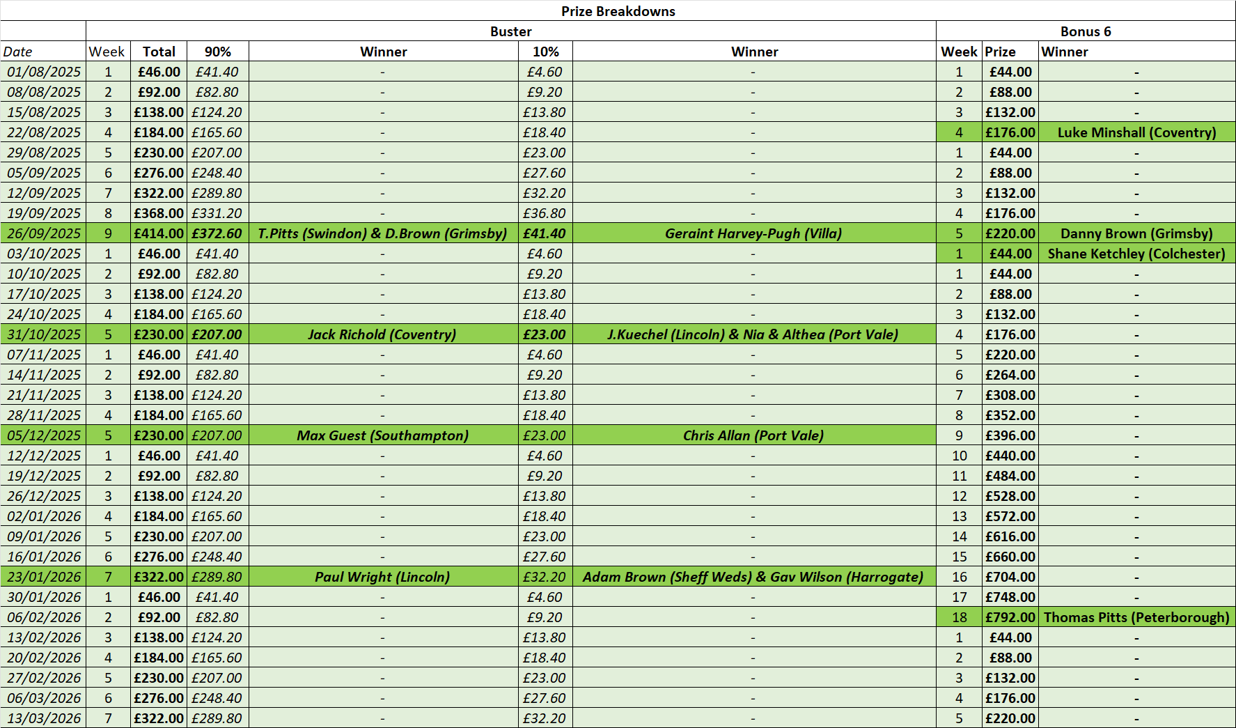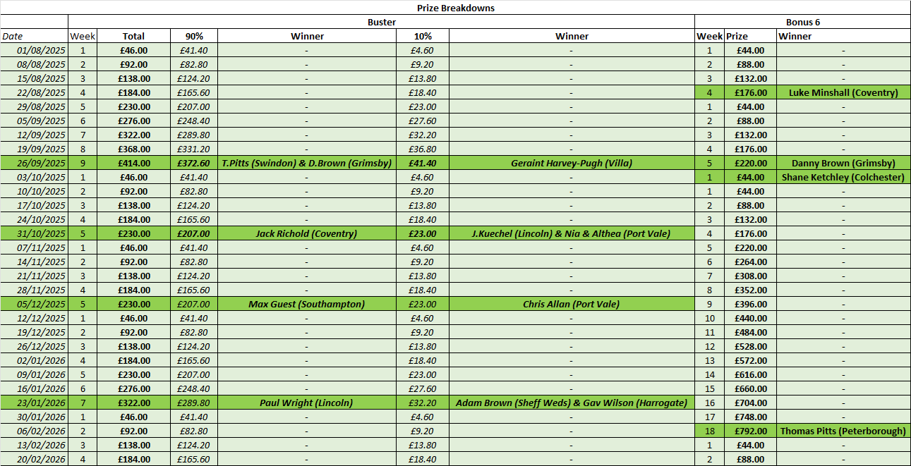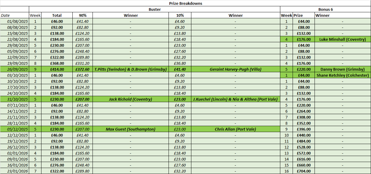 The Bonus 6 was won by Danny Brown on 27th September too, but as the Bonus 6 game runs Friday to Thursday, there’s chance for other teams to also score 6 and share the £220 prize fund with him.