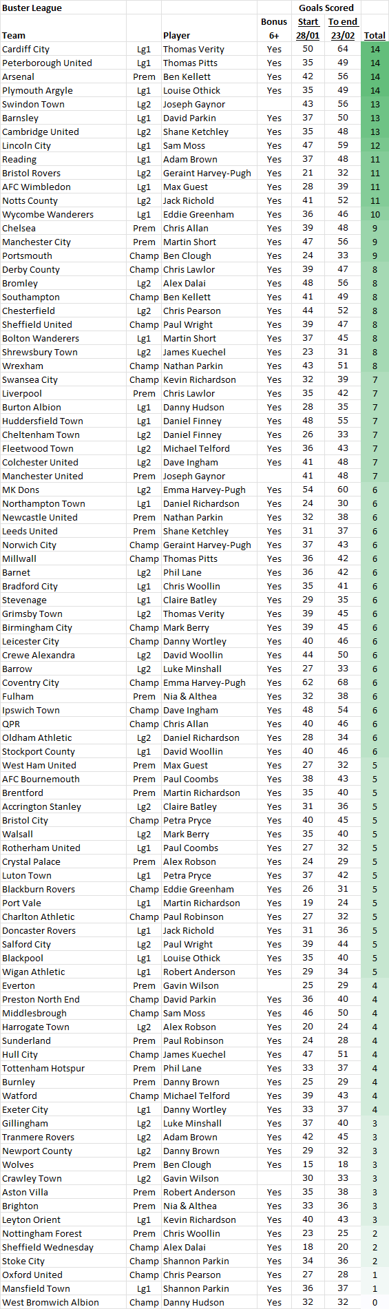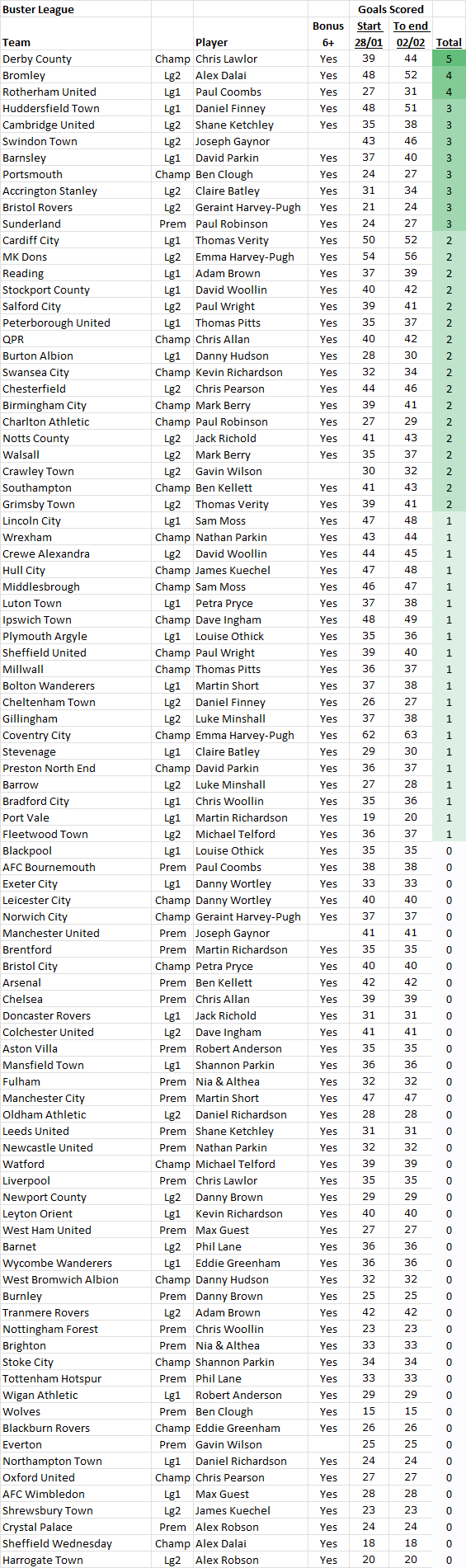 In the Bonus 6, if no-one gets 6 goals, it will be shared amongst those with 5. Currently West Brom have 5 for Phil Barr. The Bonus 6 will run until the end of the season.