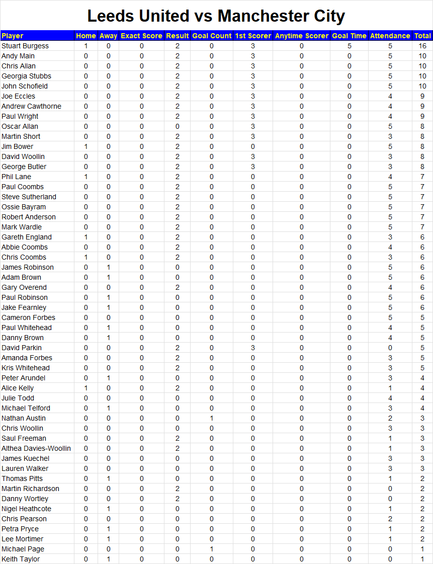 Below you will find all the points scored per match. You can come back here after every game and see how you performed.