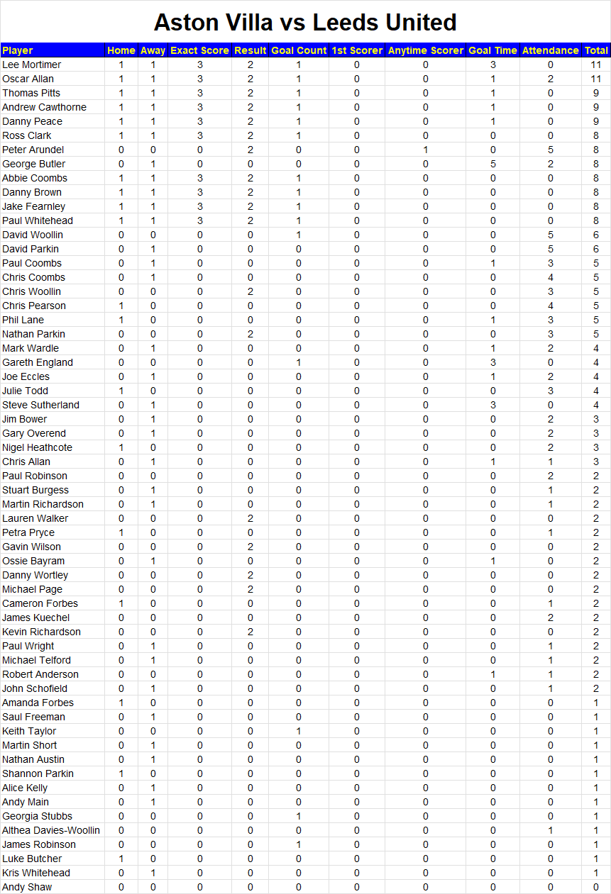 Below you will find all the points scored per match. You can come back here after every game and see how you performed.