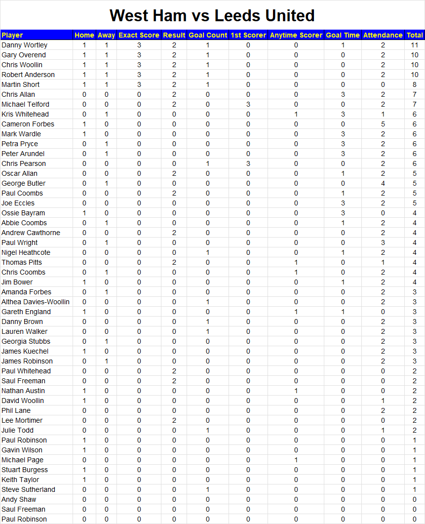 Below you will find all the points scored per match. You can come back here after every game and see how you performed.